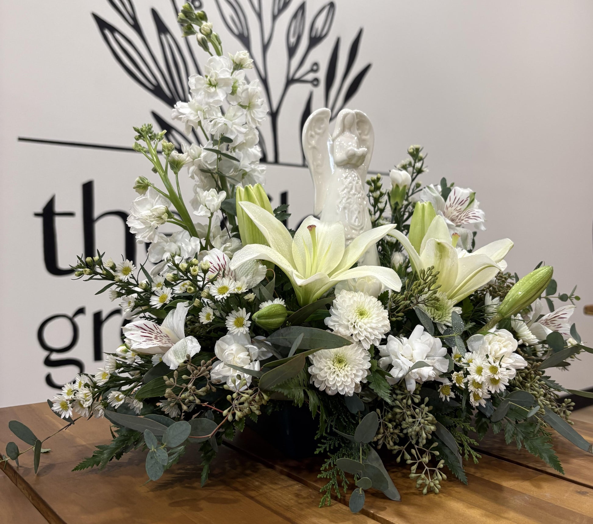 This beautiful all-white arrangement comes with a white ceramic angel, Asiatic lilies, stock, monte casino, mini carnations, buttons and a mix of greenery.