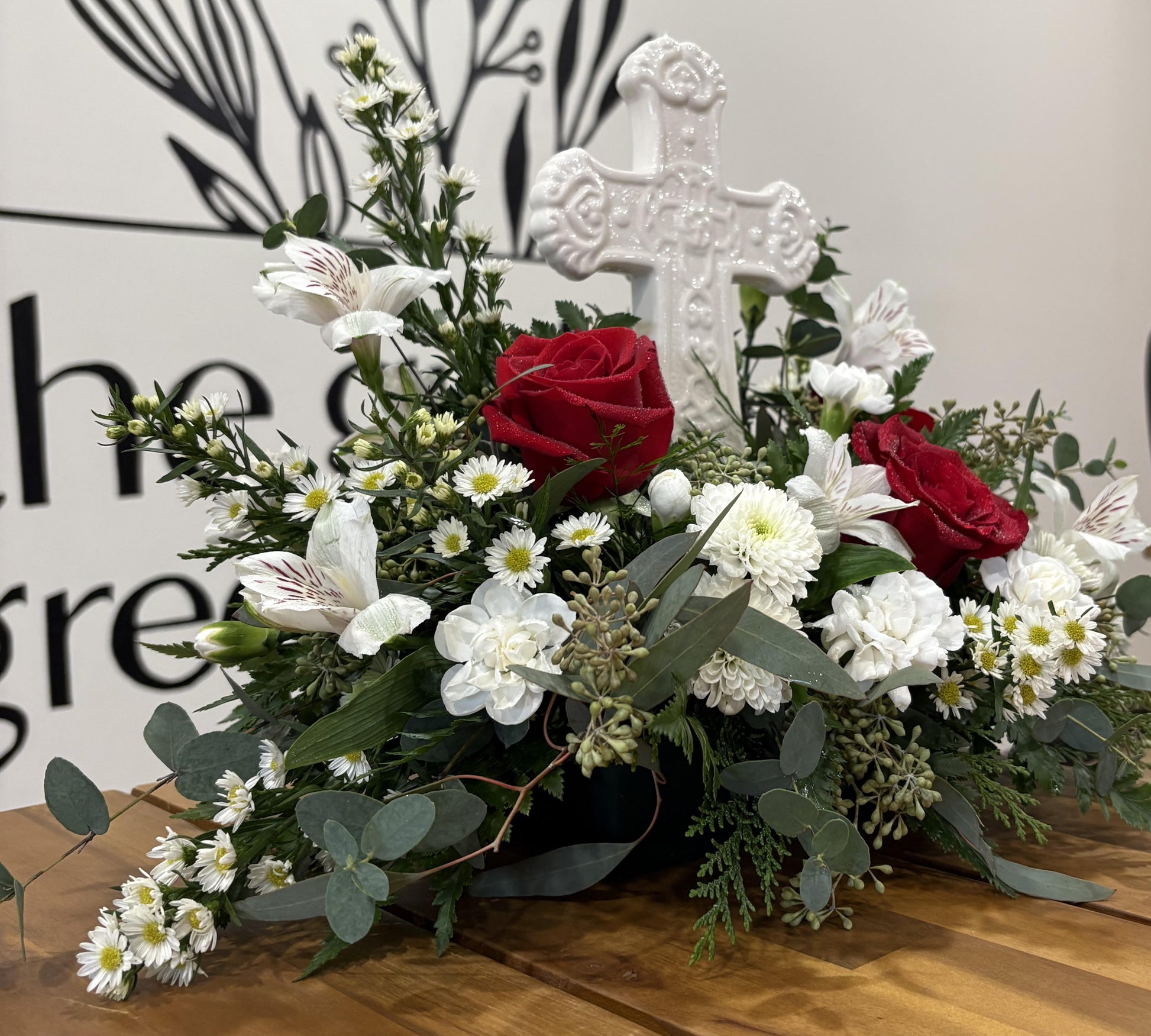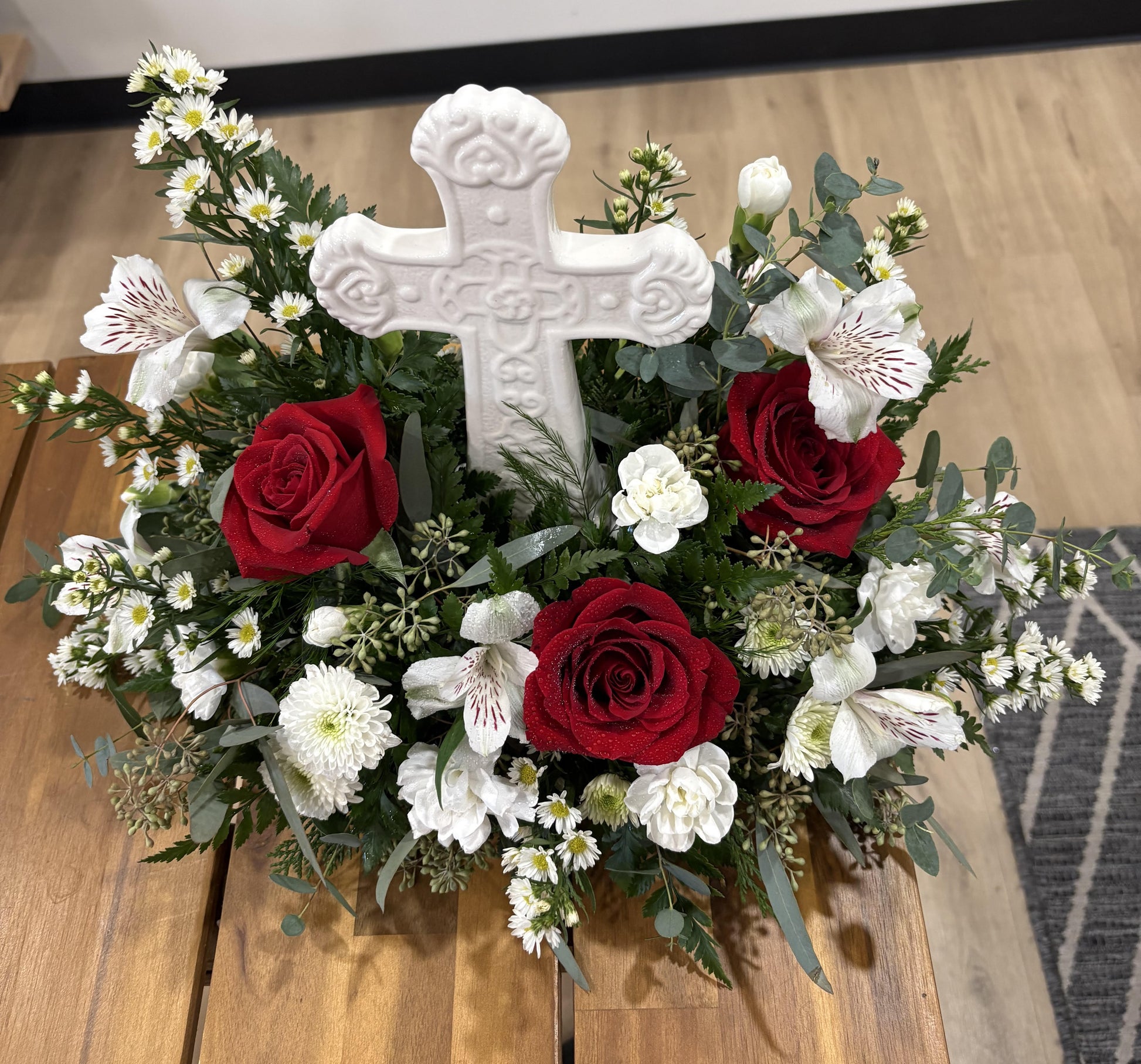 This fresh cut floral arrangement includes a white ceramic cross in the center with a mix of red roses, white alstroemeria, buttons, monte casino and mini carnations finished off with a combination of greenery.