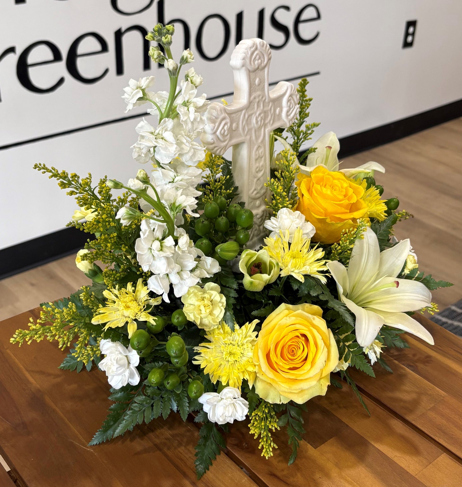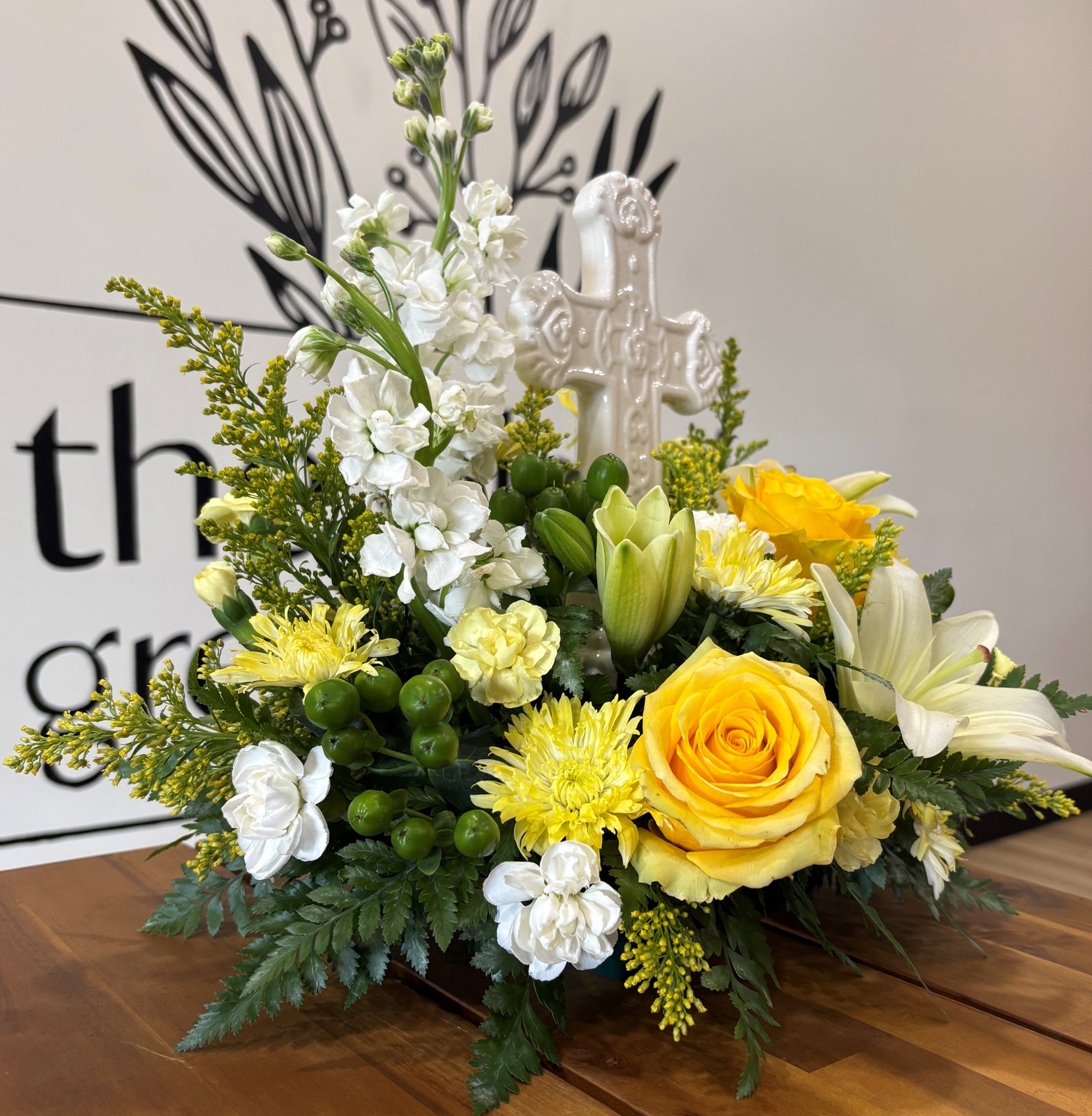 This sympathy arrangement comes with a white, ceramic cross and a mix of yellow and white flowers including Asiatic lilies, roses, stock, solidago, mini carnations, buttons, berries and traditional greenery.