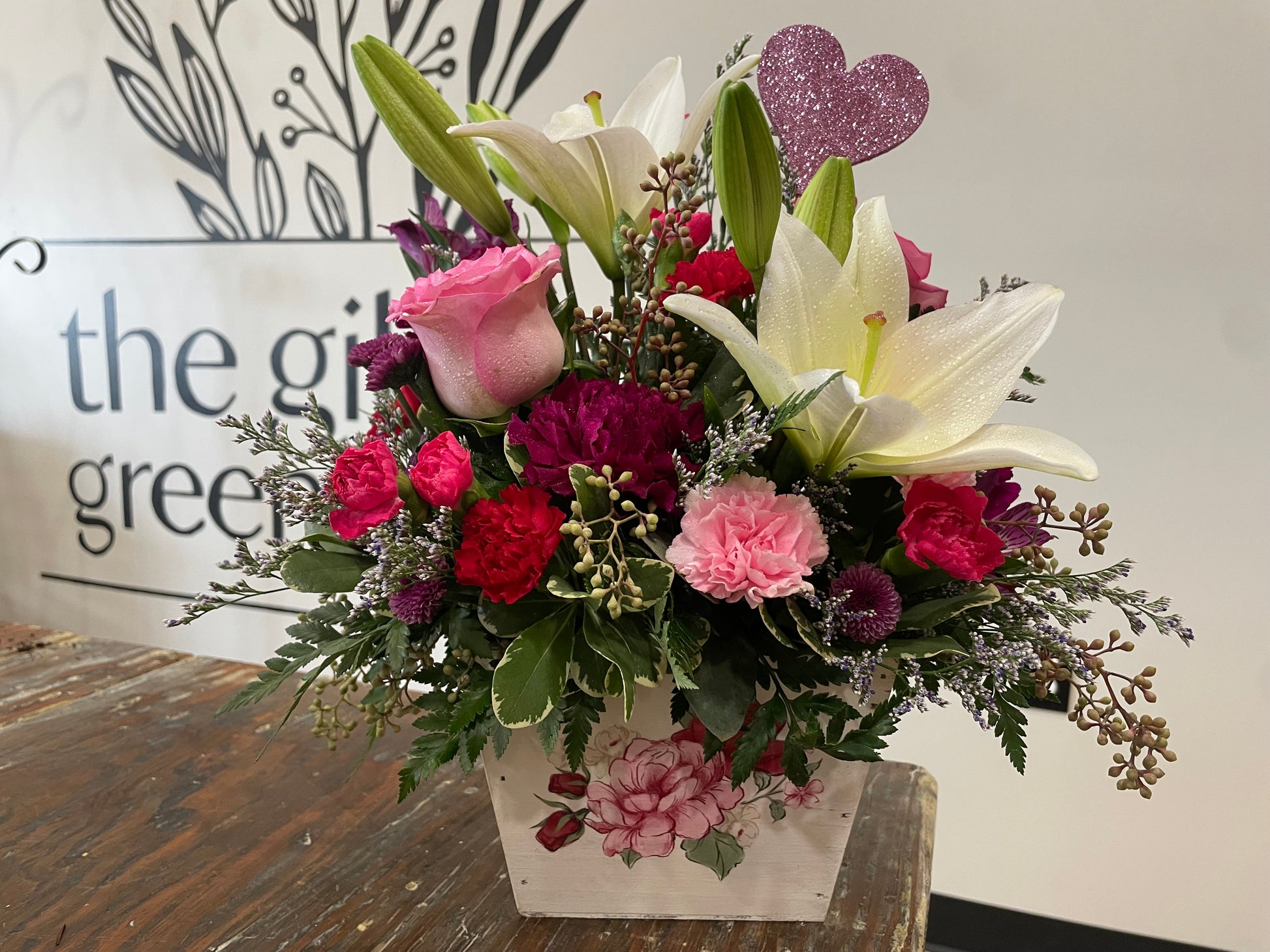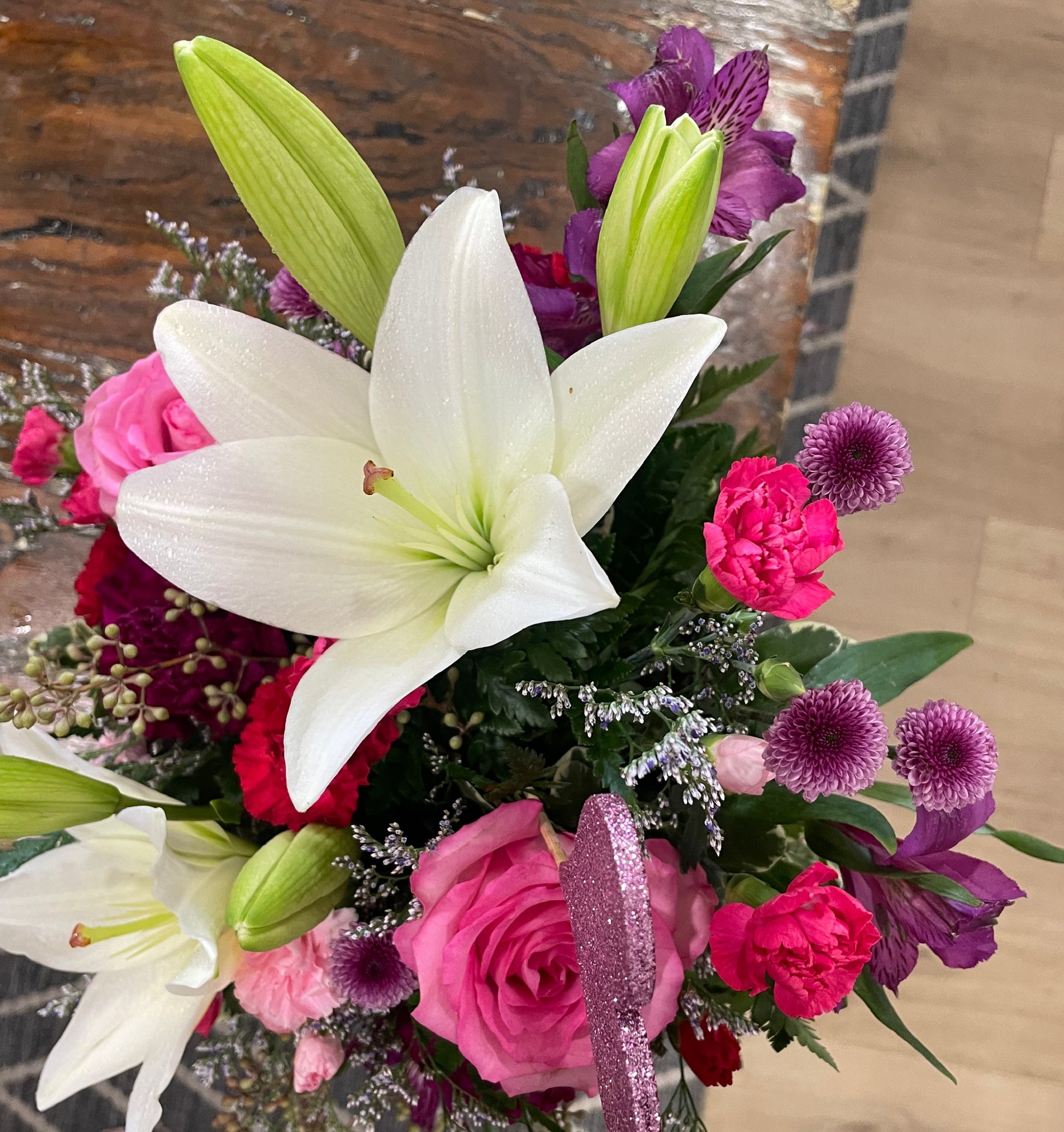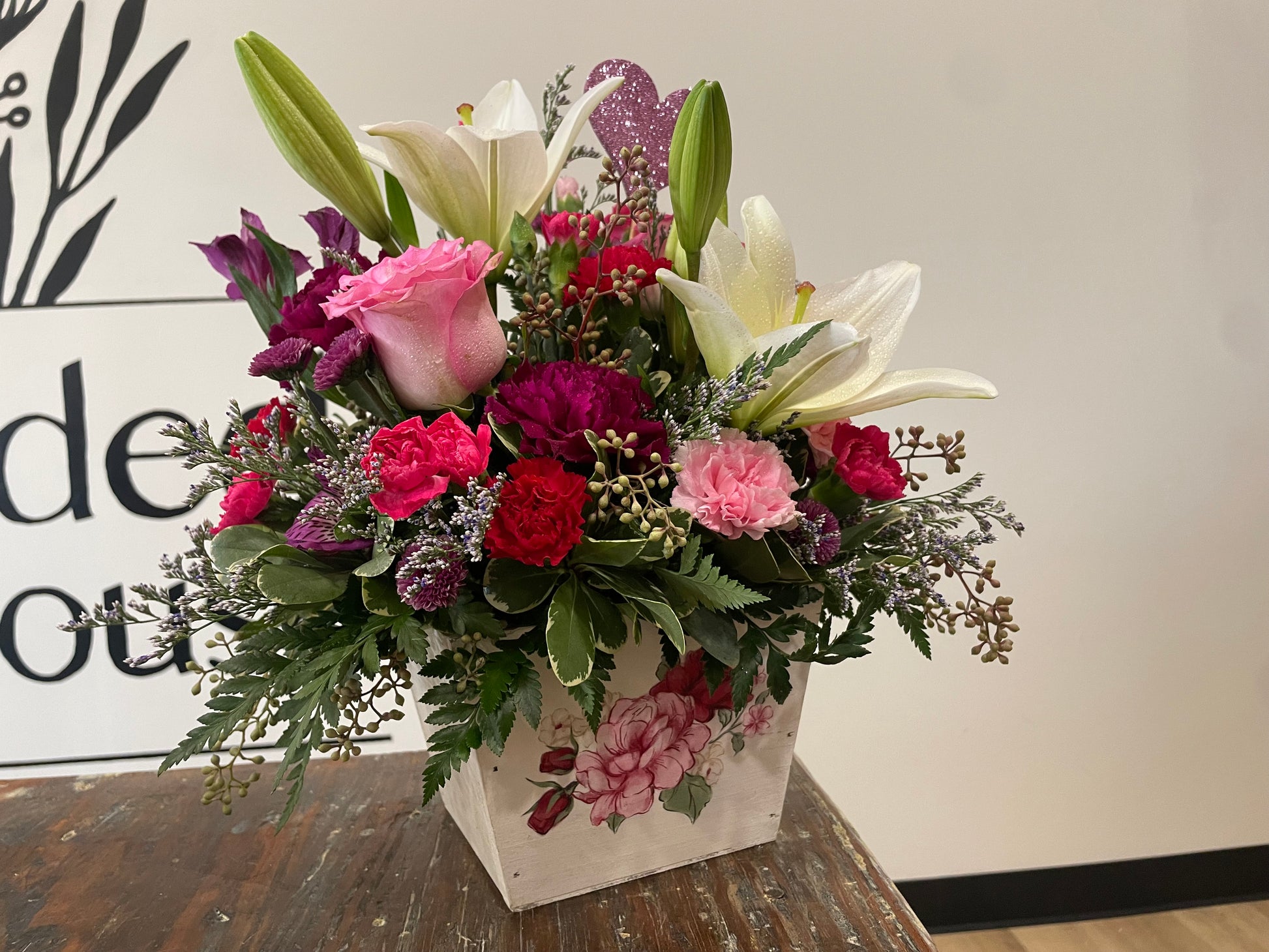 This arrangement comes in a wooden box with a beautiful cottage flower print on it and a romantic mix of flowers including roses, lilies, carnations, alstroemeria, lavender buttons and one of our favorite fillers, misty blue!!