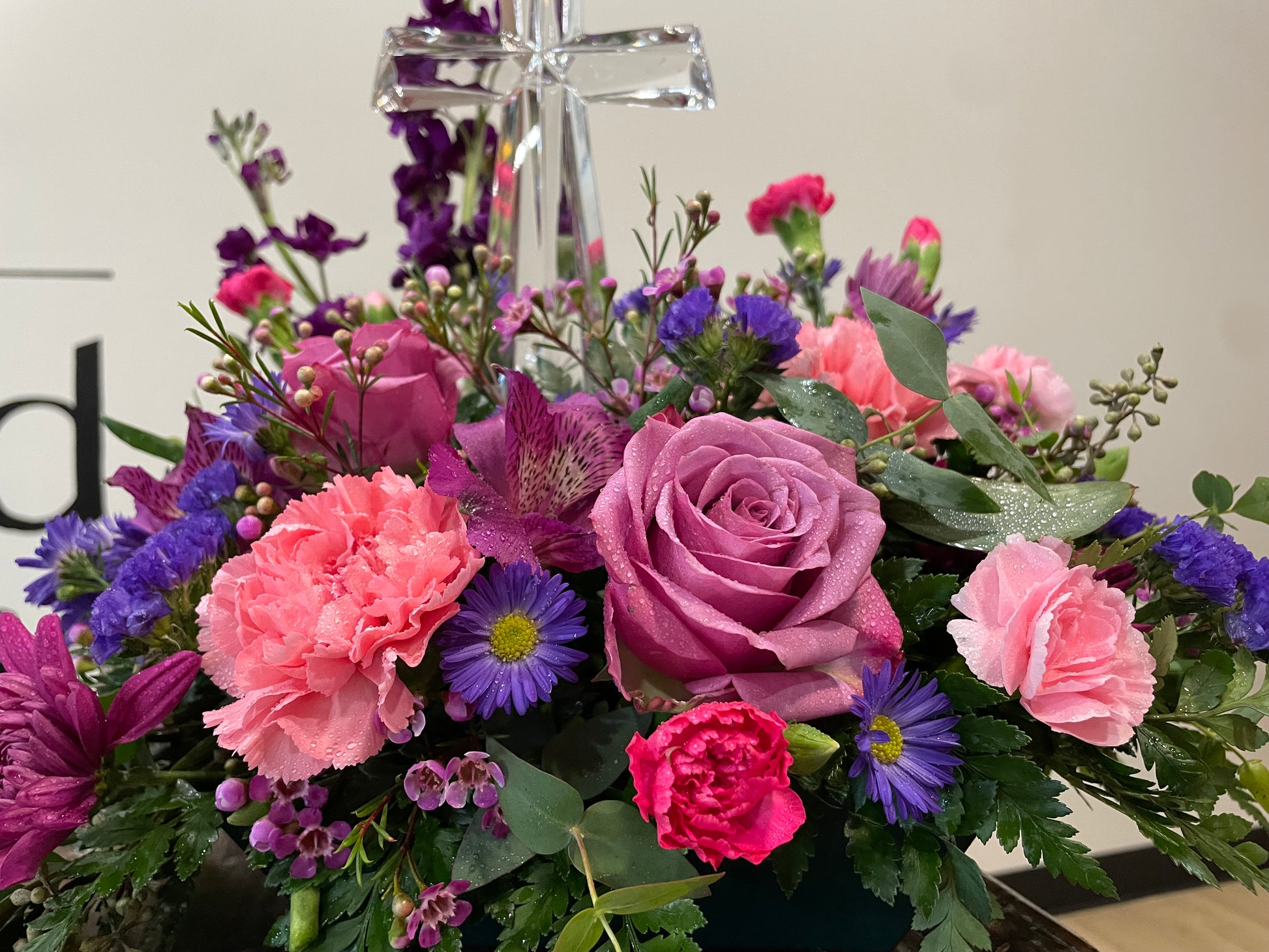 This arrangement features a mix of white flowers, arranged in floral foam to compliment the glass cross as shown. Additional flowers will be added to enhance the arrangement's impact.