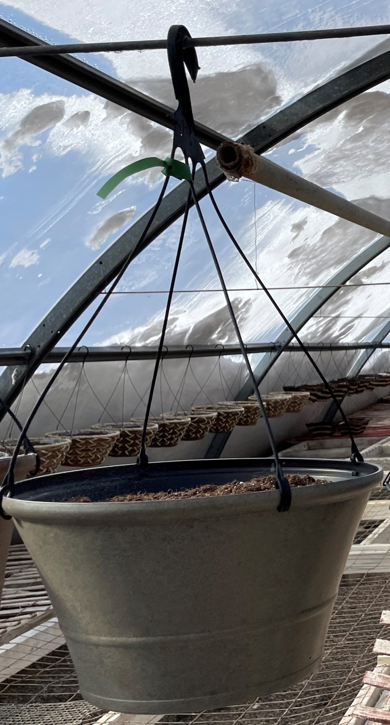 We will have a variety of blooming annuals planted in these large 14" silver-colored plastic hanging baskets. More photos to come as the plants grow and fill out the basket.