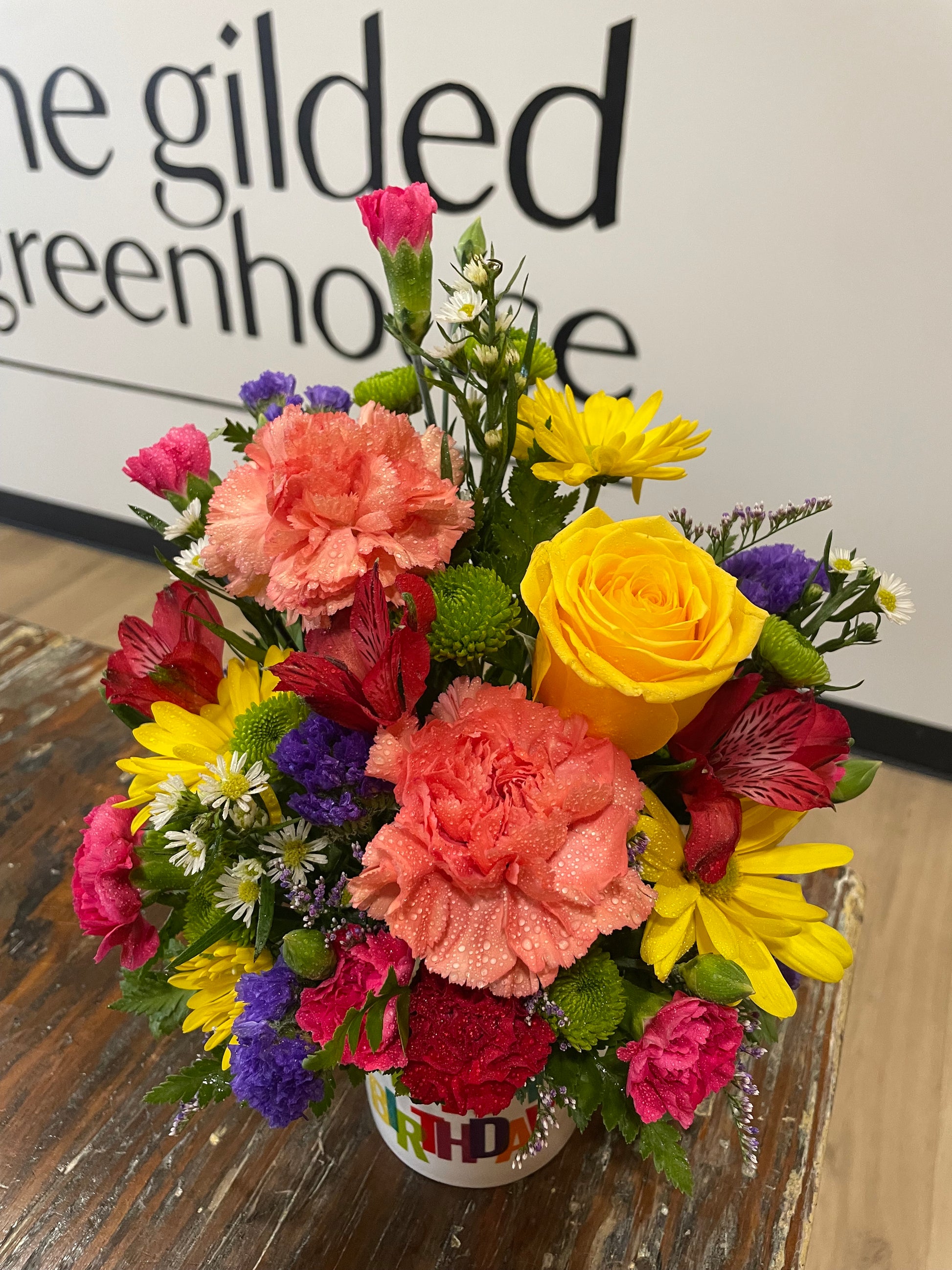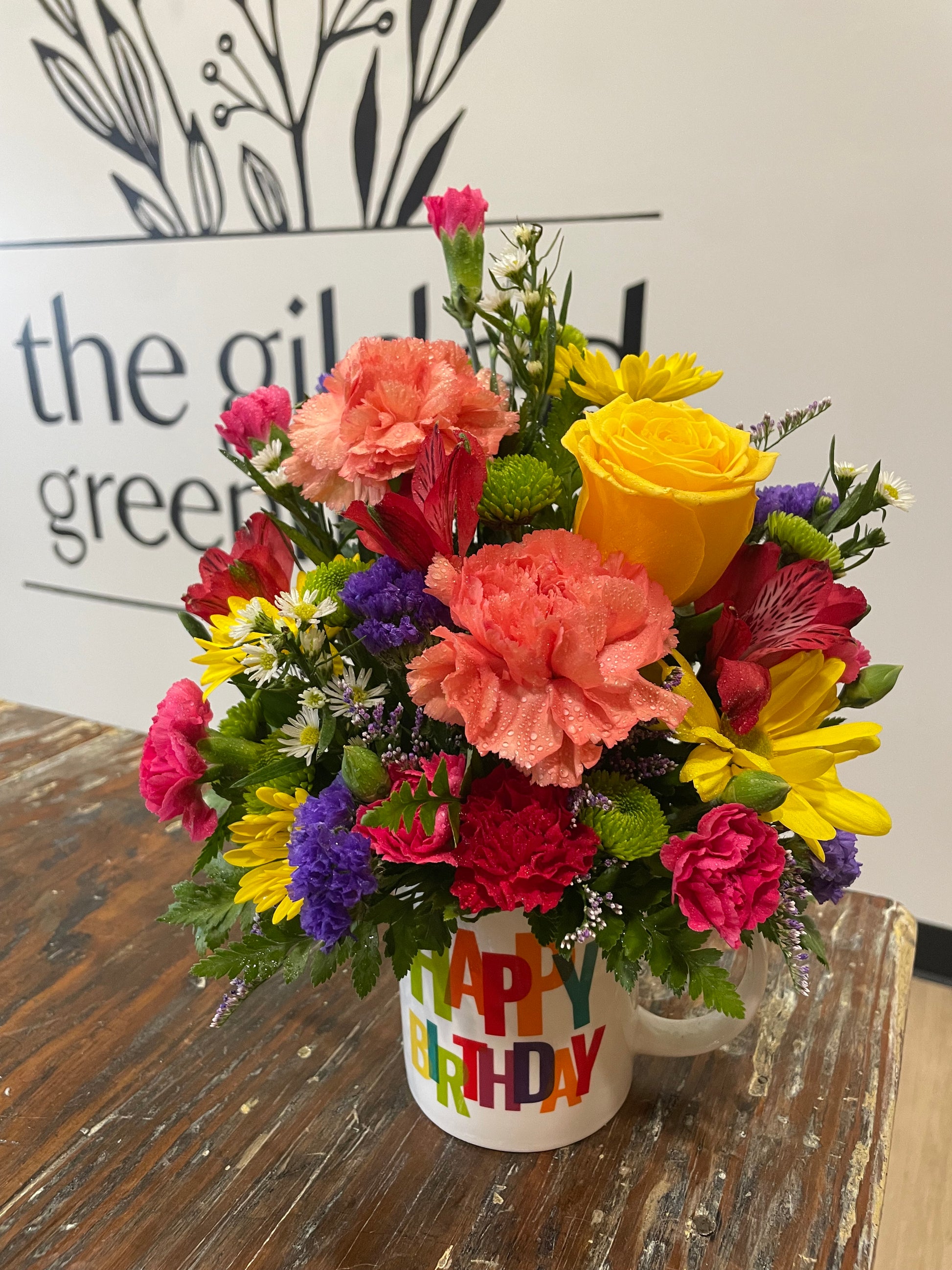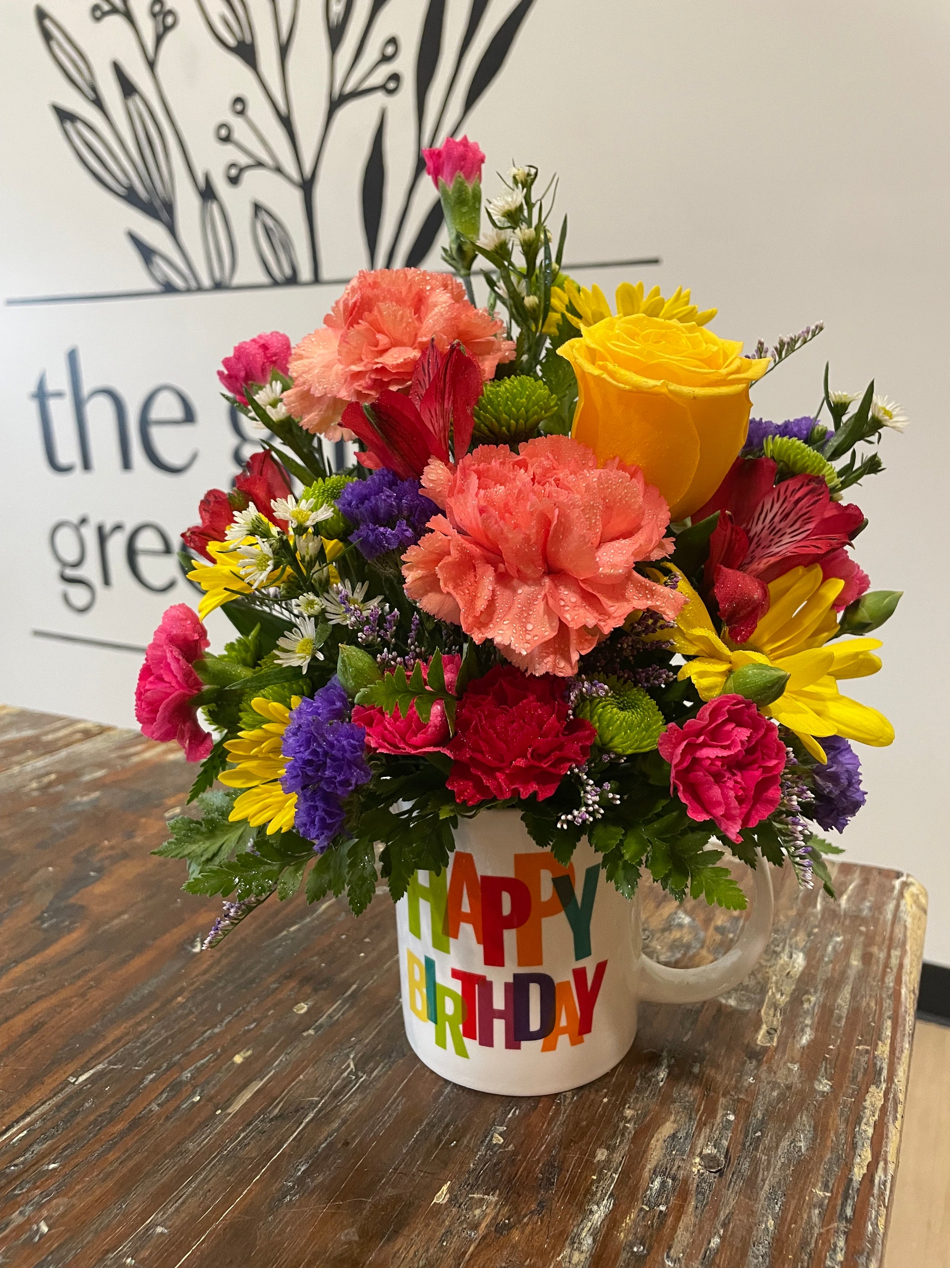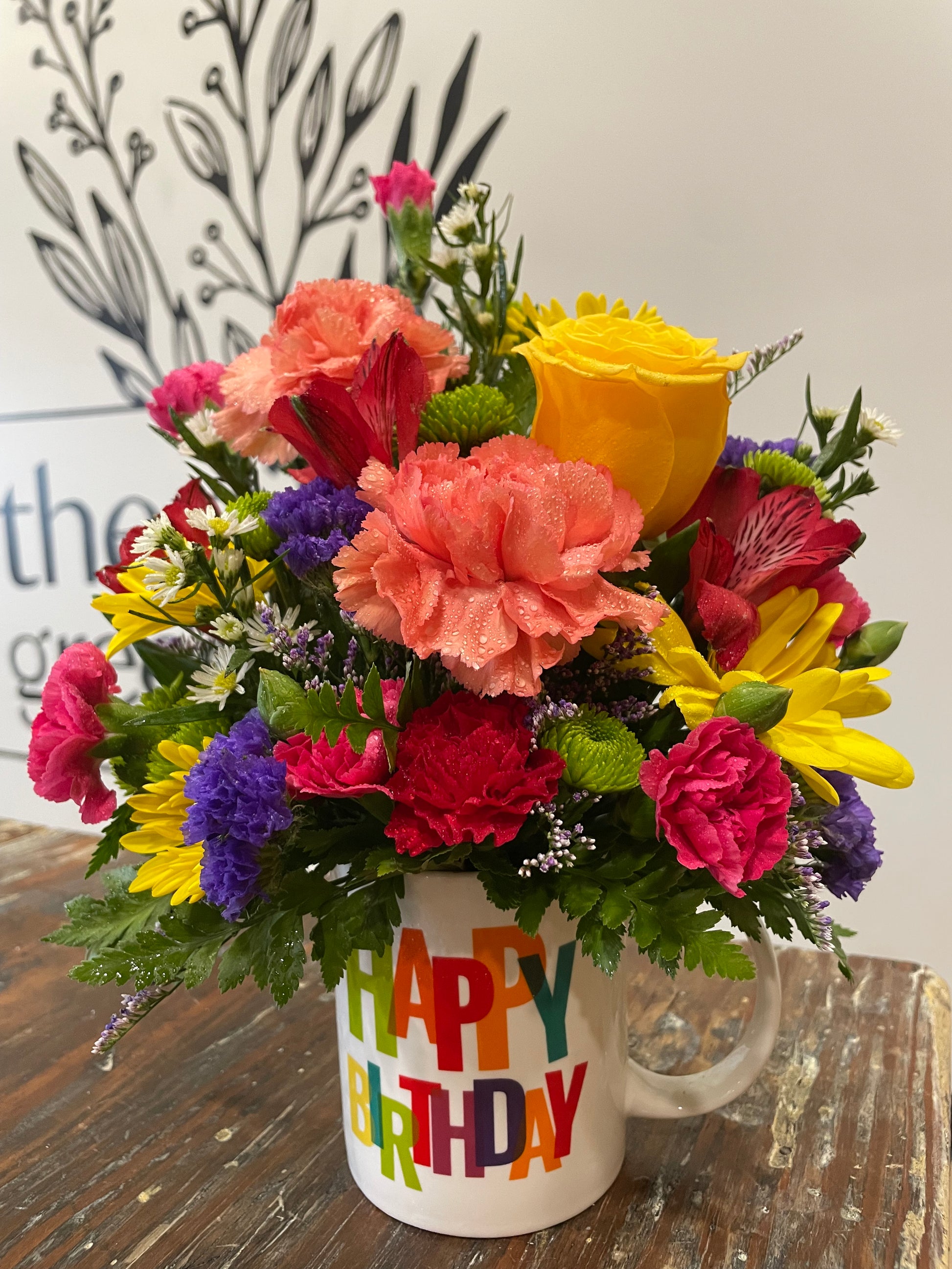 Three different designs of Happy Birthday mugs available. Flowers or mug may be substituted at time of purchase.