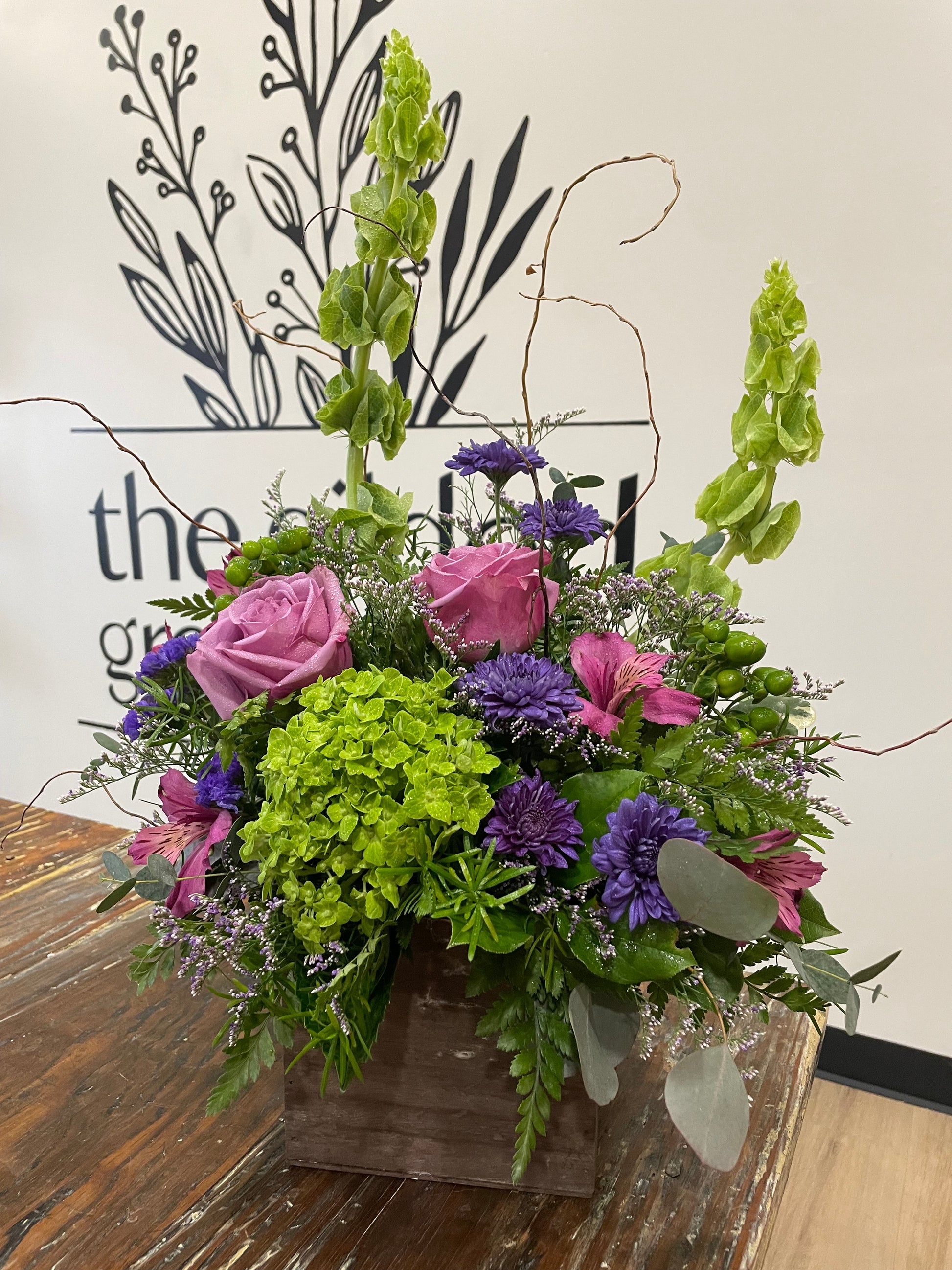 This tall arrangement comes in a dark wooden box with a mix of roses, hydrangeas, Belles of Ireland, buttons, alstroemeria, hypericum berries, limonium, curly willow and a mix of greenery. Perfect for any occasion!