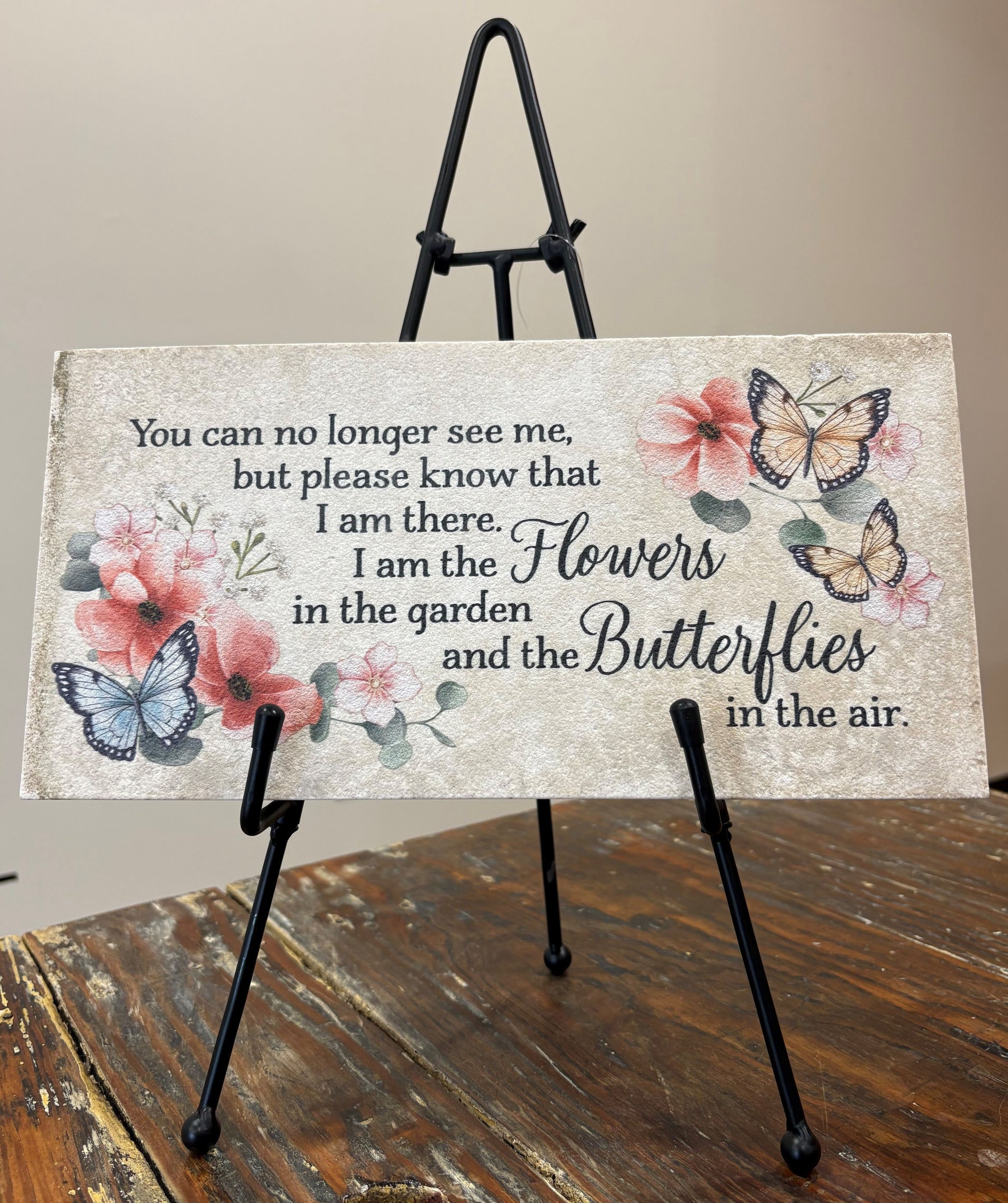 Send a beautiful marble paver with colorful butterflies on a black, metal easel to remember a loved one . The marble paver measures 6" H x 12" W x 1 1/4" D and will be sent with a bow to match.