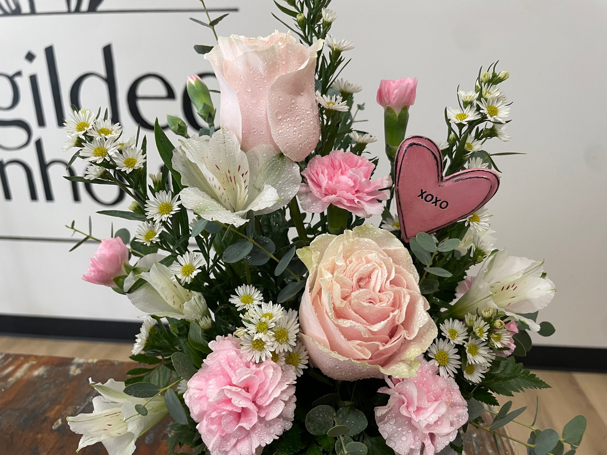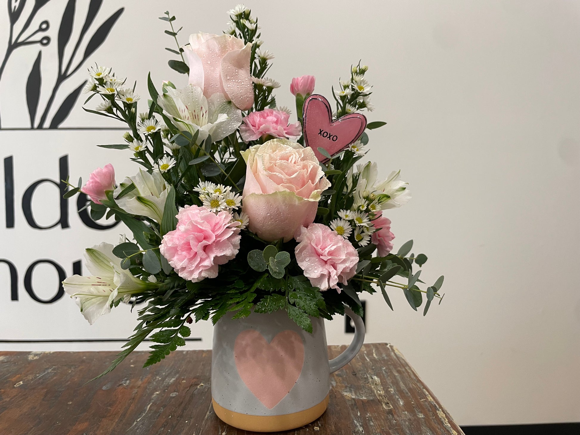 Perfect for any coffee-lover! This subtle pink arrangement comes in a ceramic coffee mug that is dishwasher and microwave safe!! A mix of pastel pink and white flowers and a beautiful ceramic heart keepsake with XOXO!!