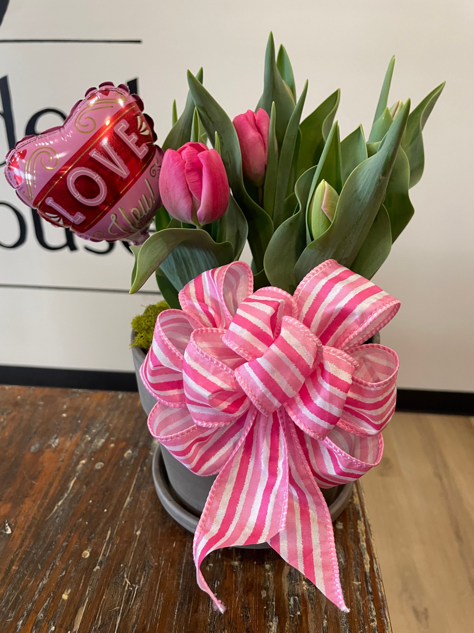 Send a pop of Spring for Valentine's Day!! These tulip bulb gardens come with 6 blooms, ceramic pot and saucer, a bow, floral pick and reindeer moss to show your love! The best part? You enjoy the blooms indoors now....and then in the Fall, you plant the bulbs in the ground to enjoy for years to come!!