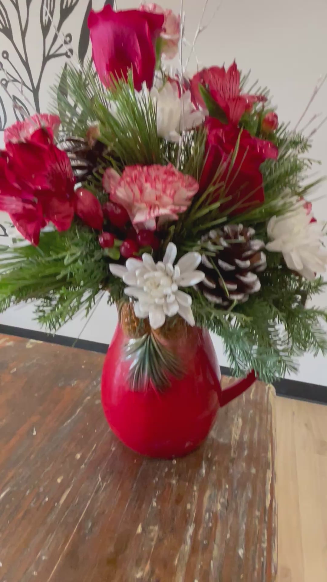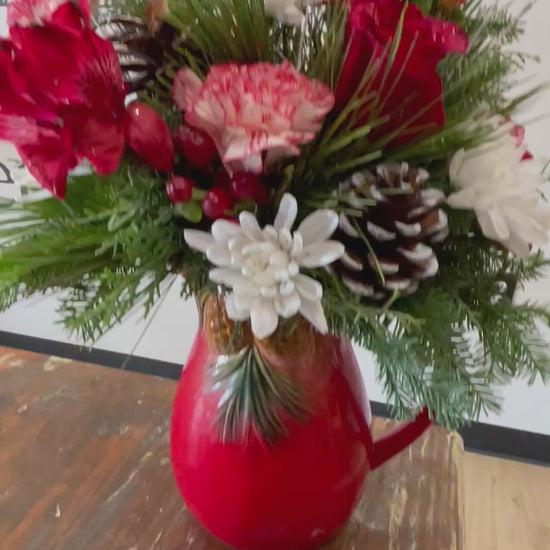 The perfect keepsake arrangement for any hostess, loved one or neighbor! The red ceramic pitcher with pine cones and greenery sets the stage for a beautiful mix of winter greens, red roses, alstroemeria, white cushions and carnations with pinecones and white snowy sticks to round it out. Surely, a show-stopper!