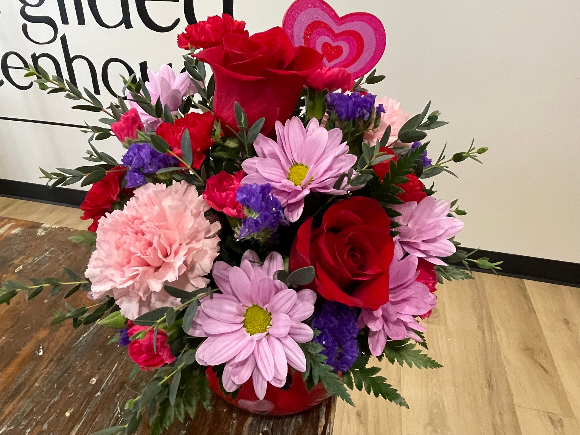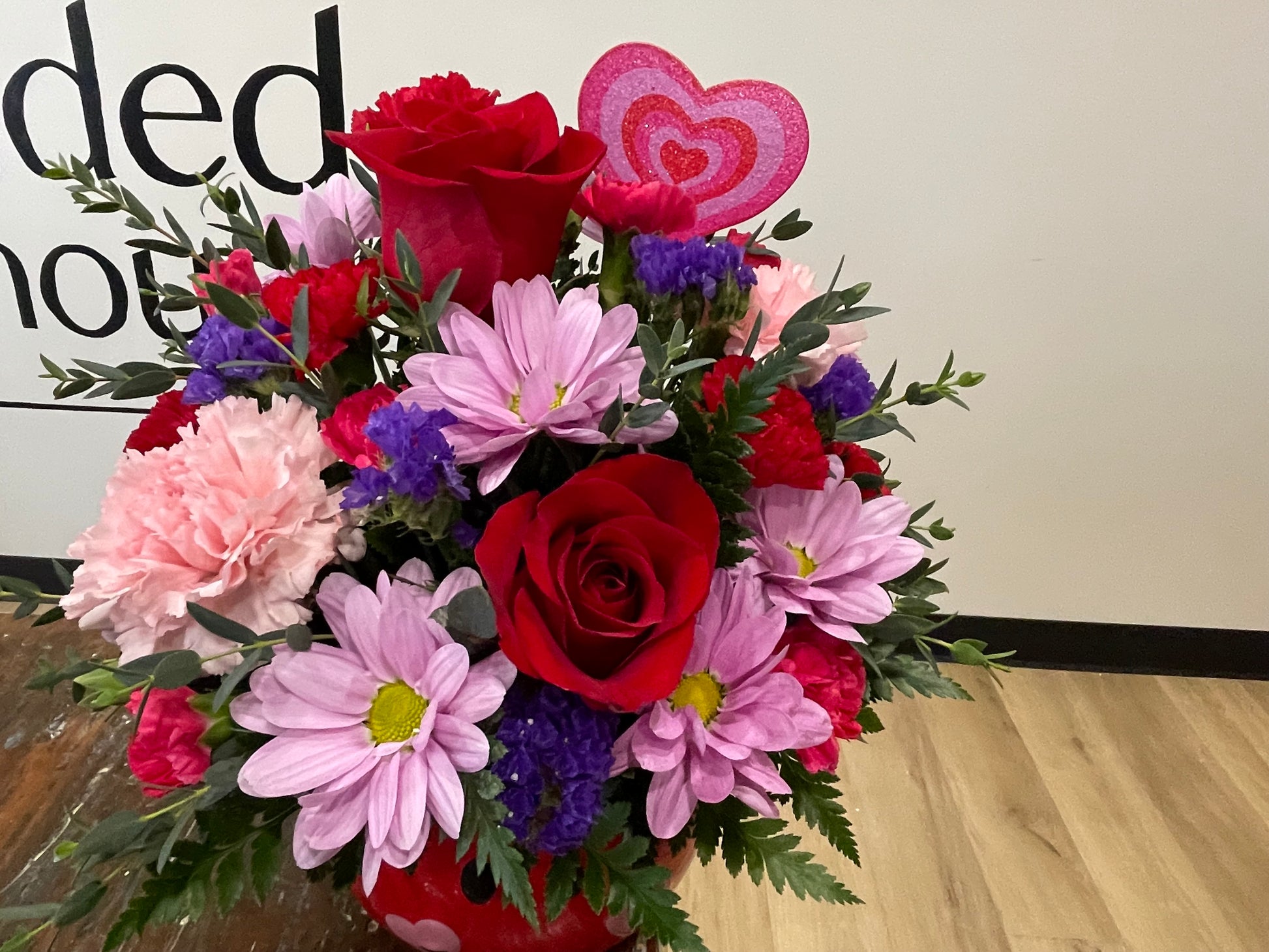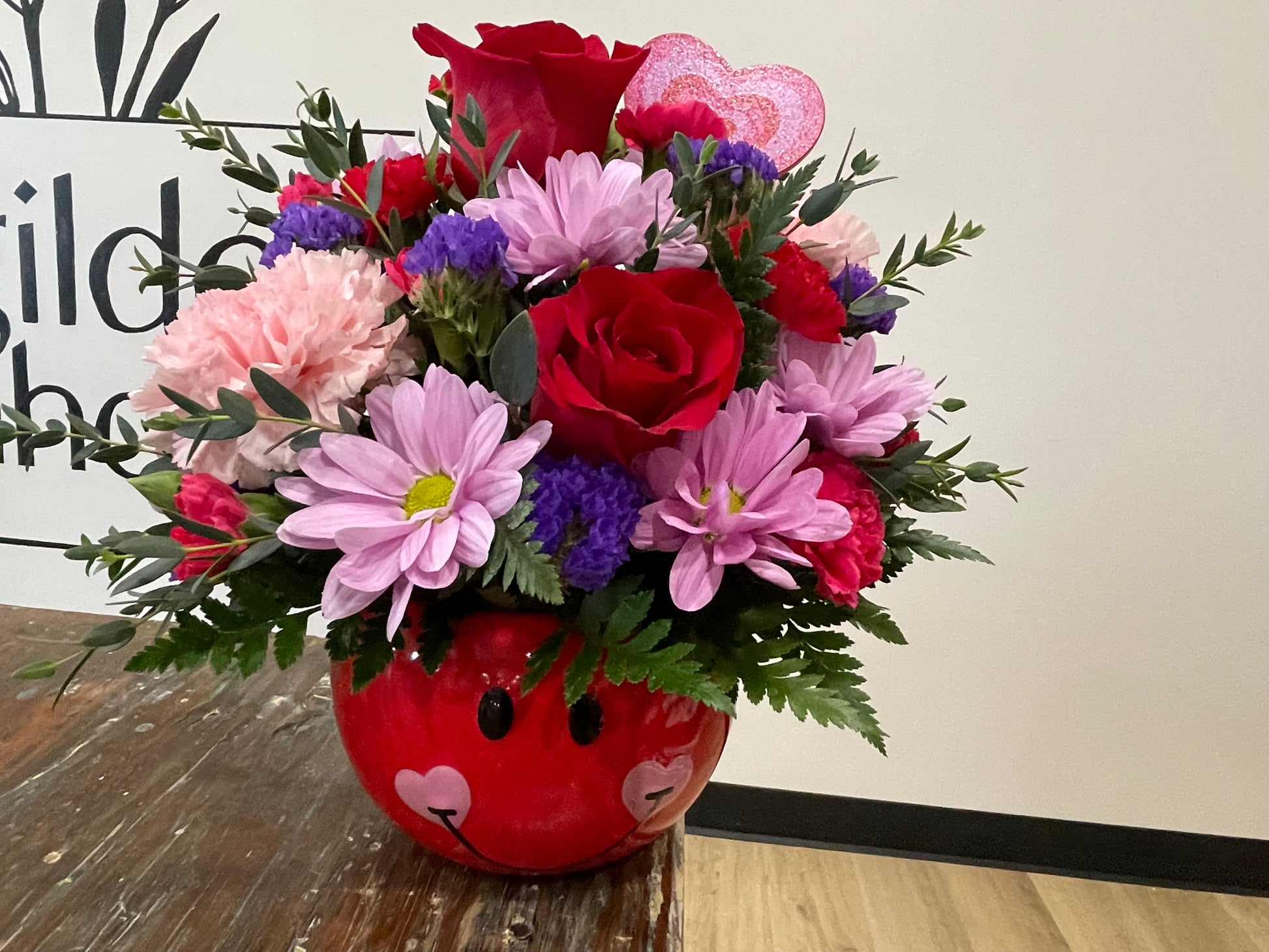 Red smiley face ceramic vase with a mixture of pinks, reds and purples in roses, carnations, daisies and statice, a mix of greenery, and a floral heart pick.