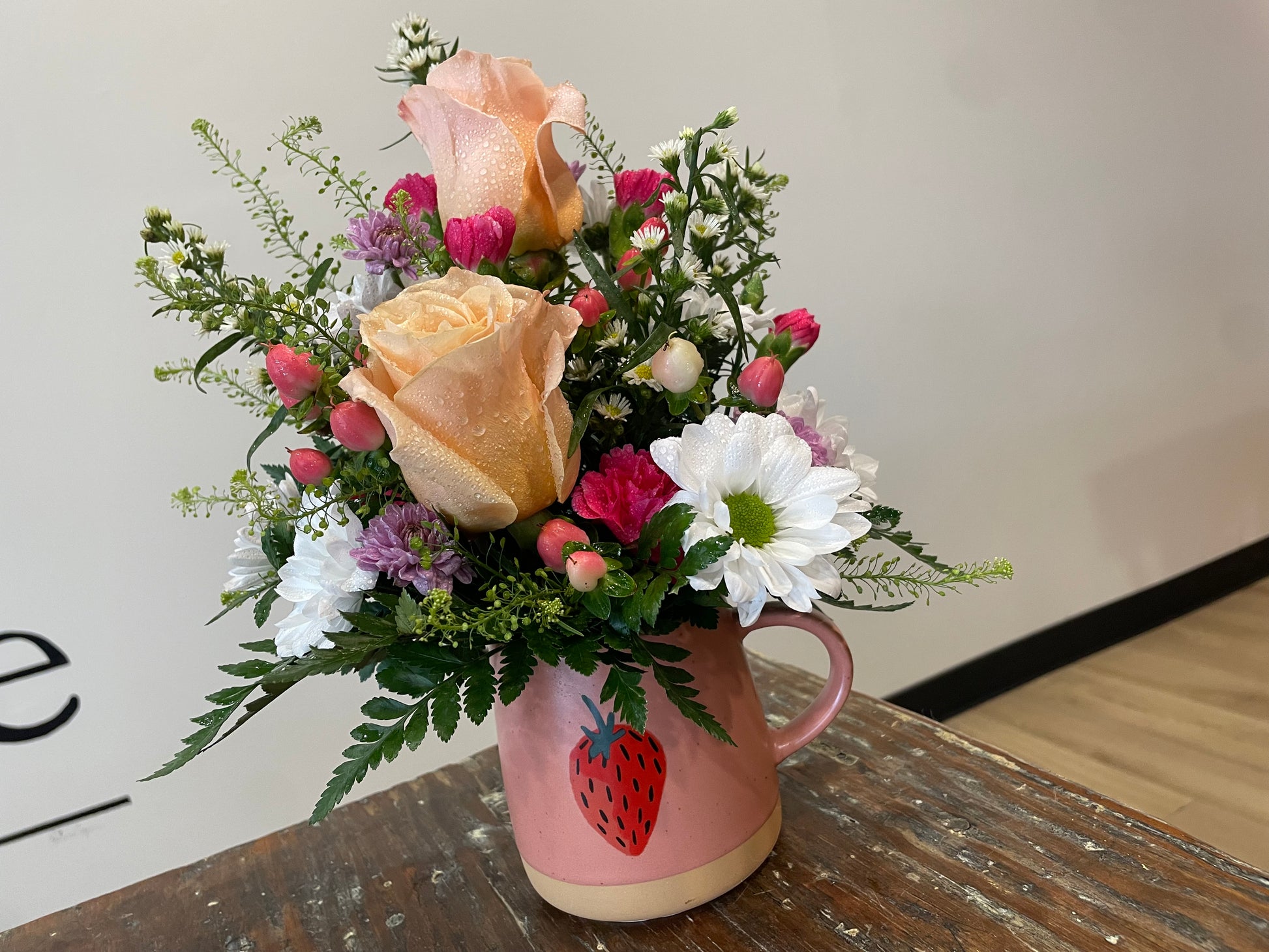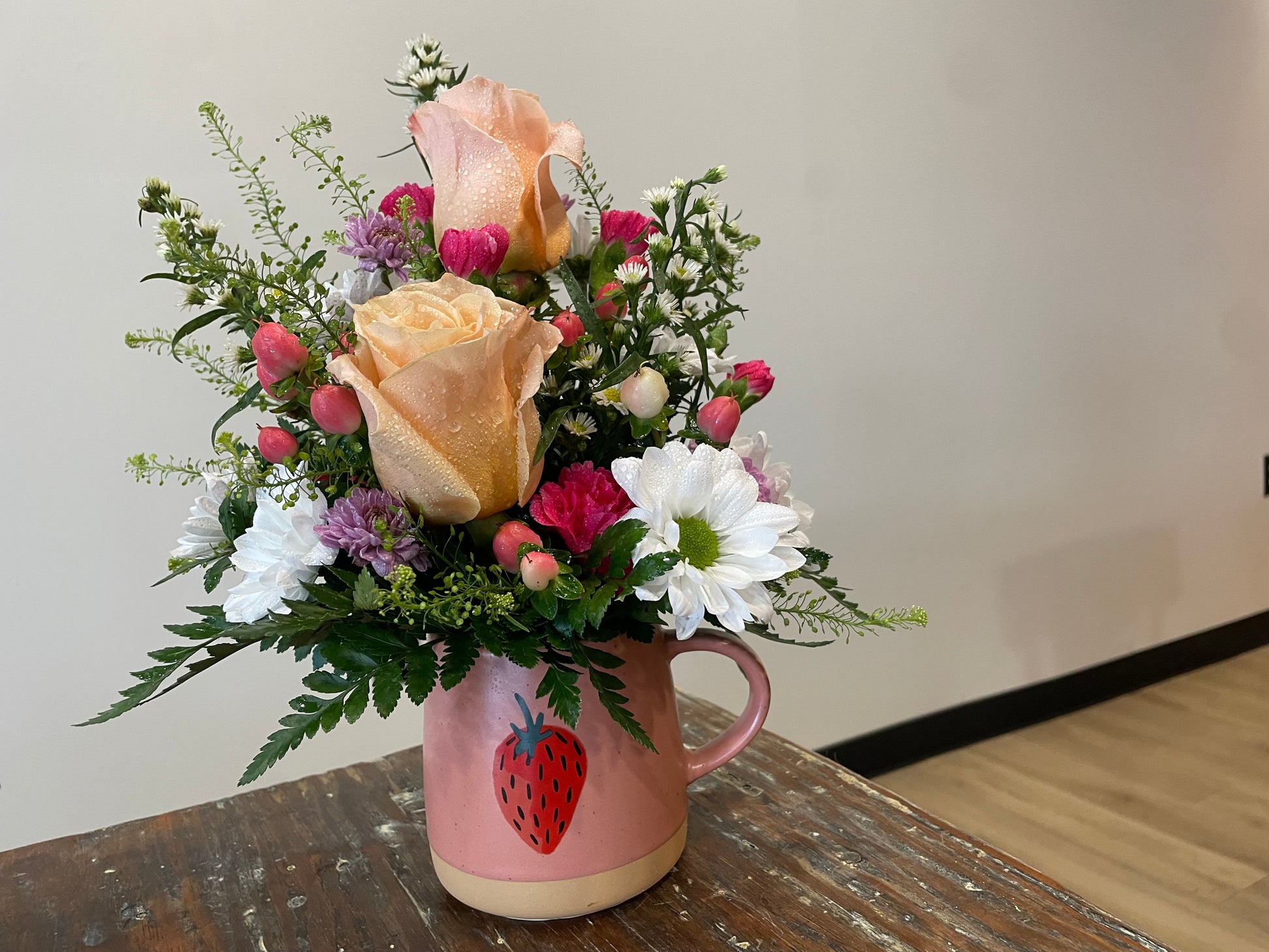 This cure, little strawberry mug arrangement will brighten anyone's day!! The mug is dishwasher and microwave safe; after the flowers expire, you can have a warm sip of joy in your mug!!
