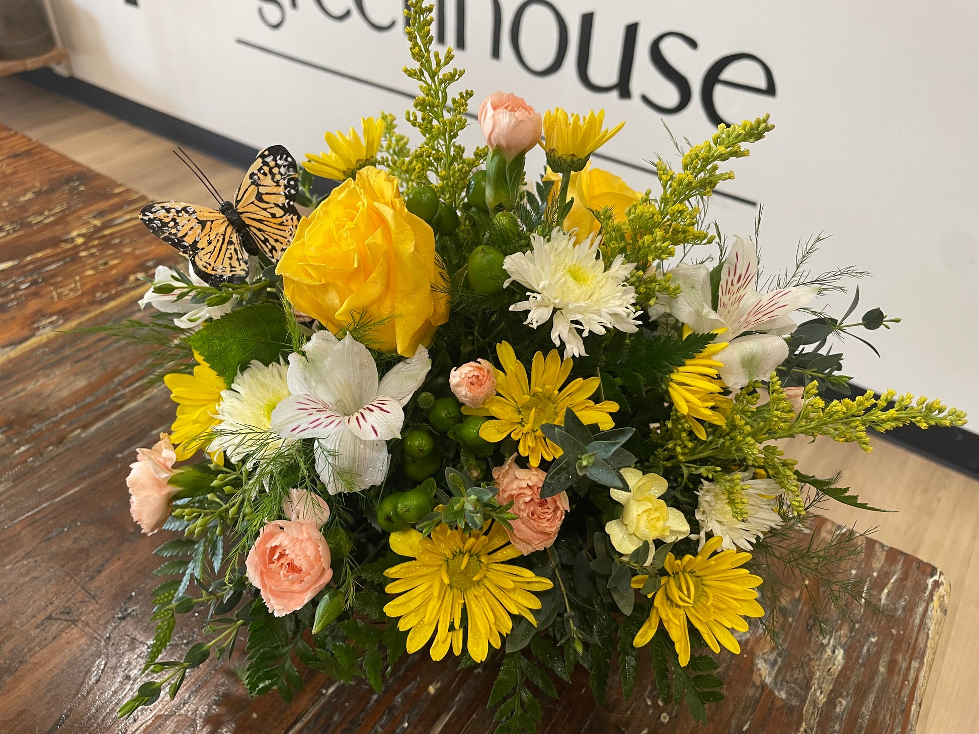 What a cute little basket!! A bright mix of yellow, white and some peach flowers including roses, daisies, mini carnations, alstroemeria, solidago, hypericum berries, buttons, and a mix of traditional greenery with a cute butterfly to finish it off!!